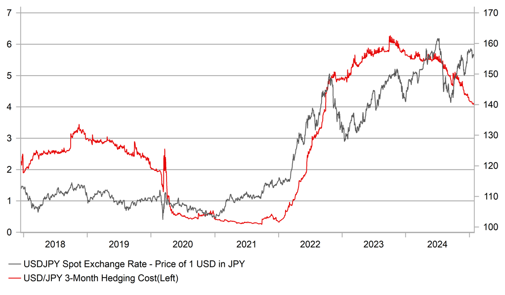COST OF 3MTH USD/JPY HEDGING IS DECLINING AND WILL ENCOURAGE YEN-BUYING HEDGING