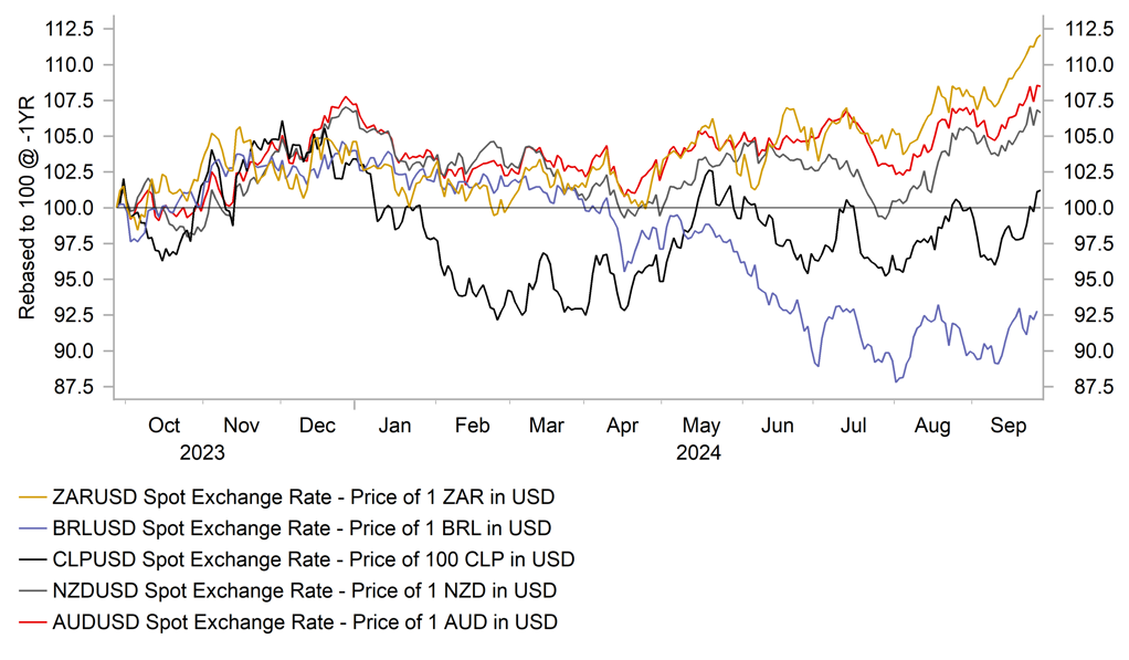 The policy shift from China quickly follows the dovish policy pivot from the Fed after they delivered a larger 50bps rate cut earlier this month. The Fed’s decision to lower rates has created more room for the PBoC and other global central banks to keep lowering rates without increasing the risk of much weaker domestic currencies. It is a favourable development for the global growth outlook and has helped to ease investor concerns over a harder landing for the global economy. Global commodity prices have already started to respond with Bloomberg’s commodity price index rising by around 7% from this month’s lows and reversing weakness over the summer. However, there are still pockets of weakness amongst commodity prices. In recent days the price of oil has fallen back towards year to date lows undermined by concerns that a shift could also take place in the strategy of OPEC+ members. The Financial Times reported that Saudi Arabia is ready to abandon its unofficial oil price target of USD100/barrel as it shifts its focus towards preserving market share. The report states that Saudi Arabia is committed to increasing production as planned on 1st December after the recent two month delay according to people familiar with the country’s stance. While the report has not been officially confirmed, it does pose downside risks to our forecast (click here) for the price of oil to be held between USD80 and 90/barrel in the year ahead. Oil supply concerns are currently dampening upward pressure on the price of oil from a potential pick-up in demand from China. The IEA recently downgraded their forecasts for China oil demand this year due to weakness over the summer. The lower oil price helps to explain why the NOK has underperformed this week.