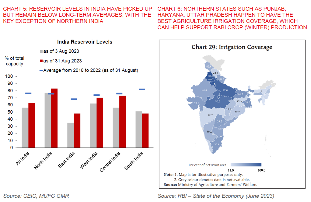 - Second, while reservoir levels are below long-term averages across India, they are close to full capacity in North India. This is important because Northern states such as Uttar Pradesh and Punjab are key wheat producers (the most important Rabi crop), and also because North India has the best agriculture irrigation facilities to begin with to benefit from elevated reservoir levels.
