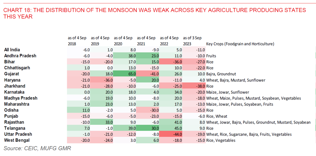 CHART 2: THE MONSOON'S DISTRIBUTION WAS ALSO CONCERNING, WITH KEY AGRICULTURE STATES GETTING LESS RAINFALL OVER THE PAST MONTH