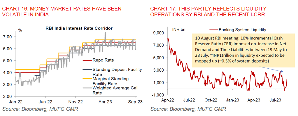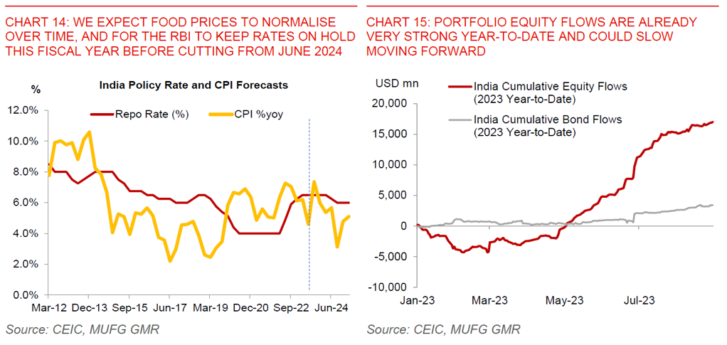 - All these imply RBI should stay hawkish for longer, but the next move should still be a cut from June 2024 assuming food prices normalise. They also imply some near-term headwinds for INR, including through slower portfolio inflows.