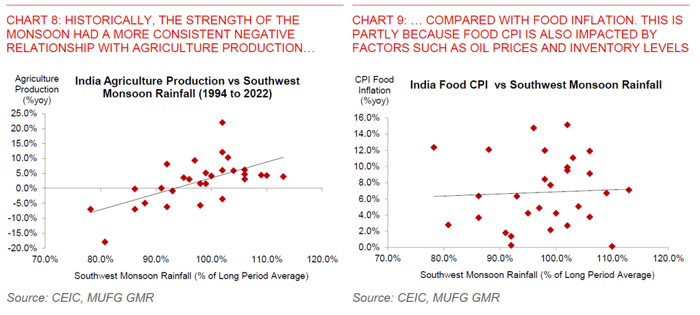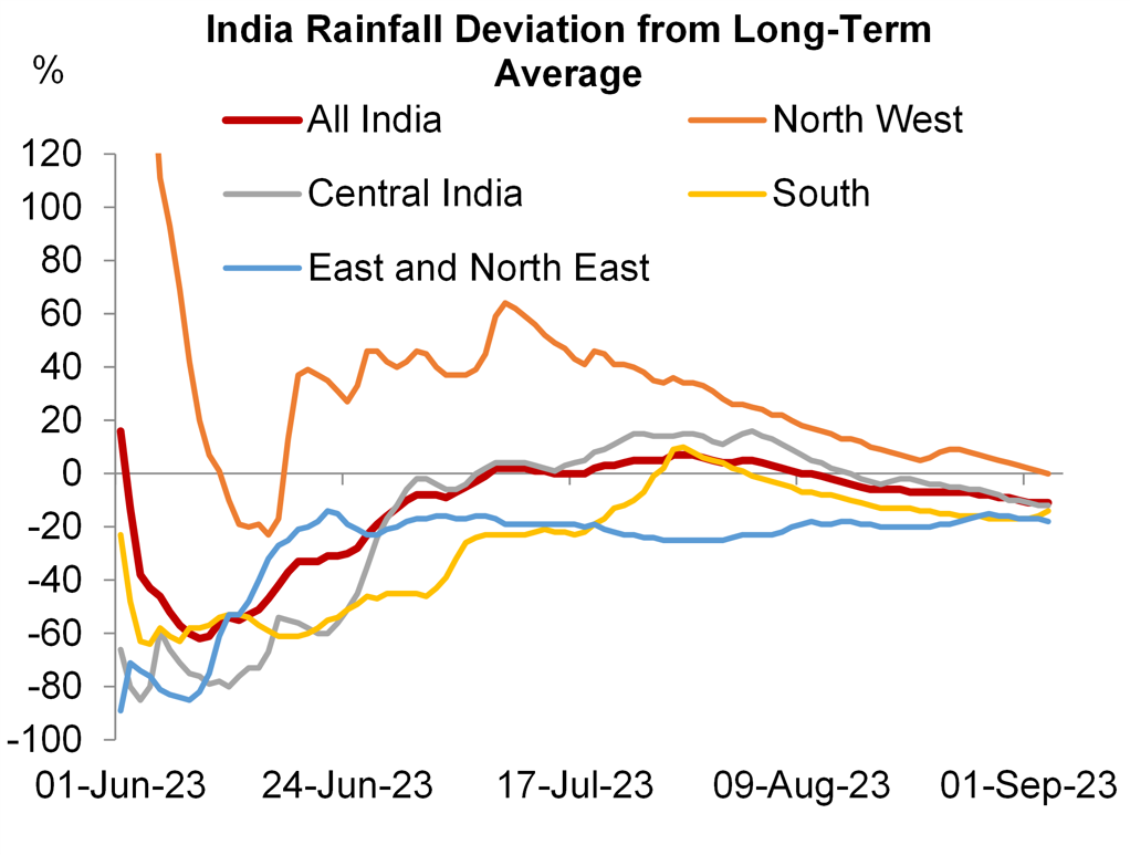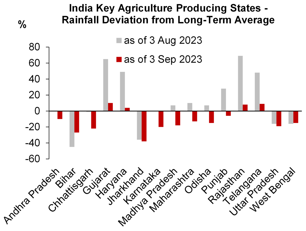 - India’s Southwest monsoon performance deteriorated meaningfully in August. It now faces a 11% rainfall deficit, down from a 5% surplus at the end of July. More importantly, the distribution of the monsoon was also concerning, with almost all agriculture producing states facing a deficit (see Charts 1 and Chart 2). This comes on the back of an increasingly likely El Nino event this year.