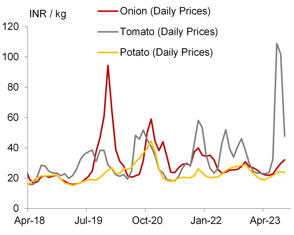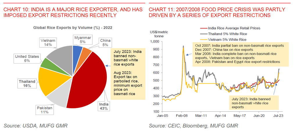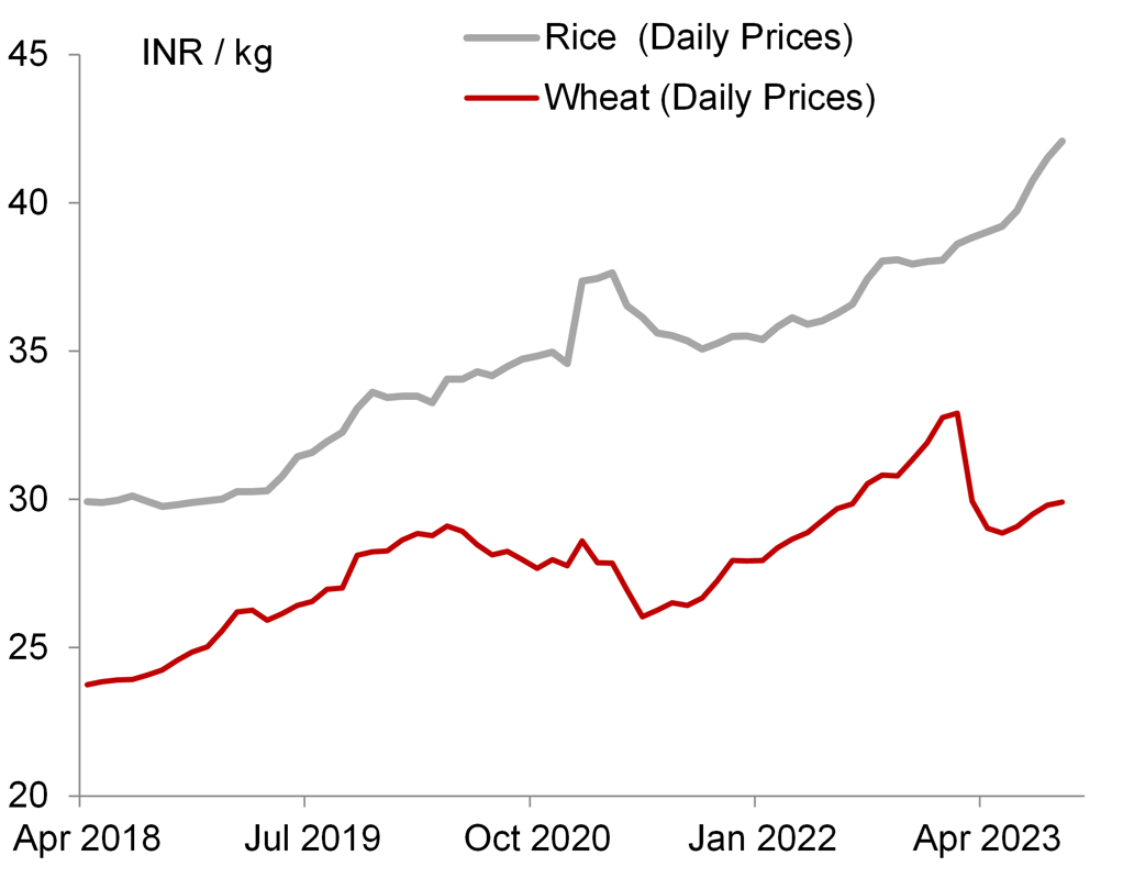 - There are at least three mitigating factors for India right now. First, tomato prices have come off their dizzying highs based on high frequency data, declining by around 50% as of September. Meanwhile, the pace of increase for rice and wheat prices has slowed, perhaps indicating some initial success from the government’s supply-side policies to control food prices (Charts 3 and 4).