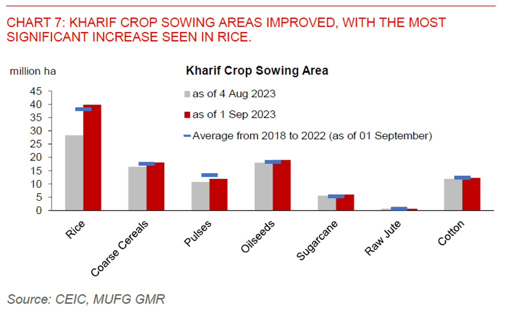 - Third, Kharif crop sowing levels are around historical averages, which could bode well for production, although this is also dependent on rainfall from here.
