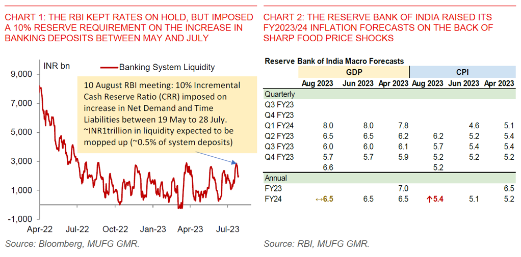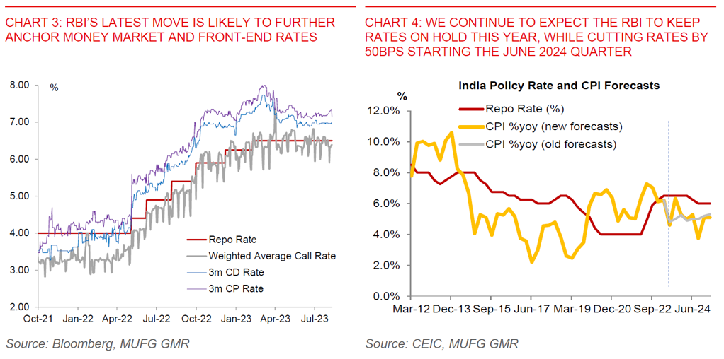 RBI’s move to impose a 10% Incremental Cash Reserve Requirement (ICRR) to mop up around INR1 trillion in liquidity (0.5% of system deposits): Nonetheless, in a move to further manage the development of liquidity and deposit growth post the withdrawal of INR2,000 banknotes, the RBI imposed a 10% reserve requirement on the increase in banking system deposits between 19 May 2023 and 28 July 2023. The RBI estimates that this will mop up around INR1 trillion in liquidity or around 0.5% of banking system deposits (see Chart 1 above). The RBI said that this measure will be reviewed again on 8 September or earlier, and ahead of festive system liquidity demand needs. This RBI move is likely to further anchor front-end and money market rates close to the repo rate (see Chart 3 below).