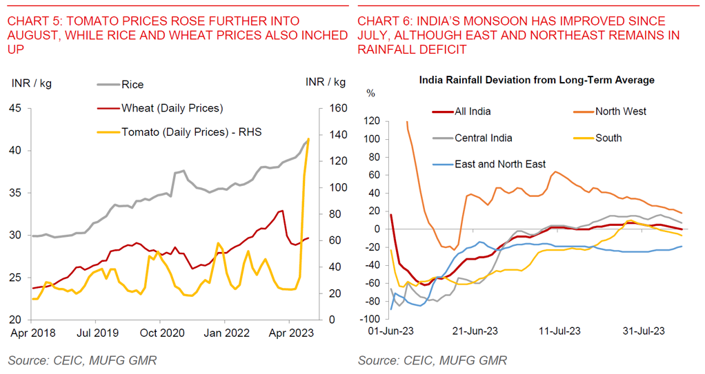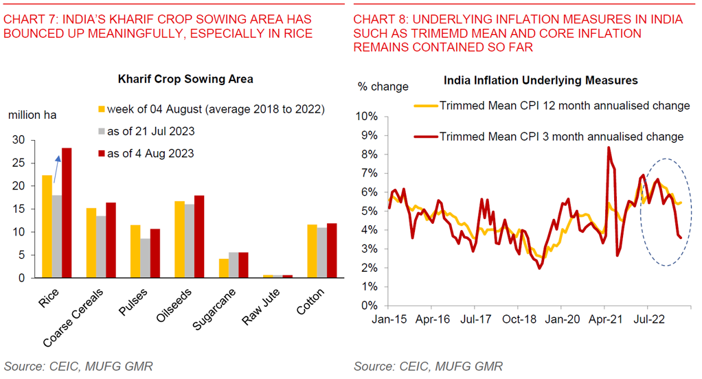 Core and underlying inflation will be key to determining RBI’s next move: Our analysis shows that the recent food price spikes have not yet spilled over to other components of the CPI basket, with underlying inflation measures such as trimmed mean, core and diffusion indices remaining well contained (see IndiaPulse: Let It Rain and Chart 8 below). The July CPI print to be released next week will be crucial in that regard to see if this trend has continued. We assume that food prices normalise over time, allowing inflation to moderate closer to trend at 5% as we move into 2024.