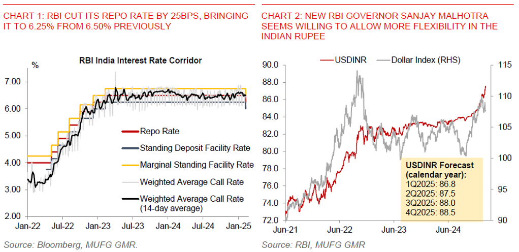 - The Reserve Bank of India cut its key repo rate by 25bps, bringing it to 6.25% from 6.50% previously. While this was in line with our forecasts (see IndiaPulse – Let it go), we note that heading into the policy meeting there was speculation of a larger rate cut, perhaps leading to USD/INR rising quickly above 87.50 this week before settling down today at 87.42. We were of the view that a jumbo rate cut at this juncture would be a policy mistake given significant global uncertainties, and as such take it as a positive for FX that they did not do so.