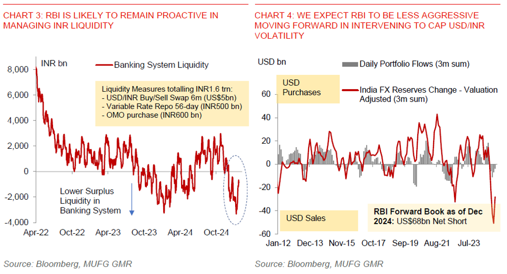- For now, we maintain our USD/INR forecast of 88.50 by the end of calendar year 2025, even as we acknowledge that the current spot rate has already exceeded our 1Q forecast.