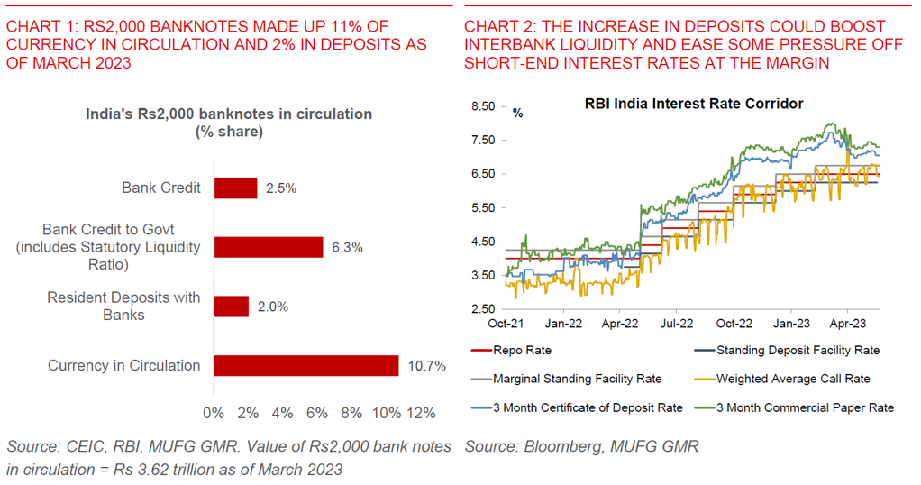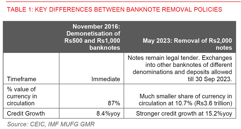 - India announced the withdrawals of Rs2,000 notes, in a move reminiscent of the Nov 2016 demonetisation policy. We think this time is different, given the transitional period (4 months) and the smaller scale (11% of currency held).