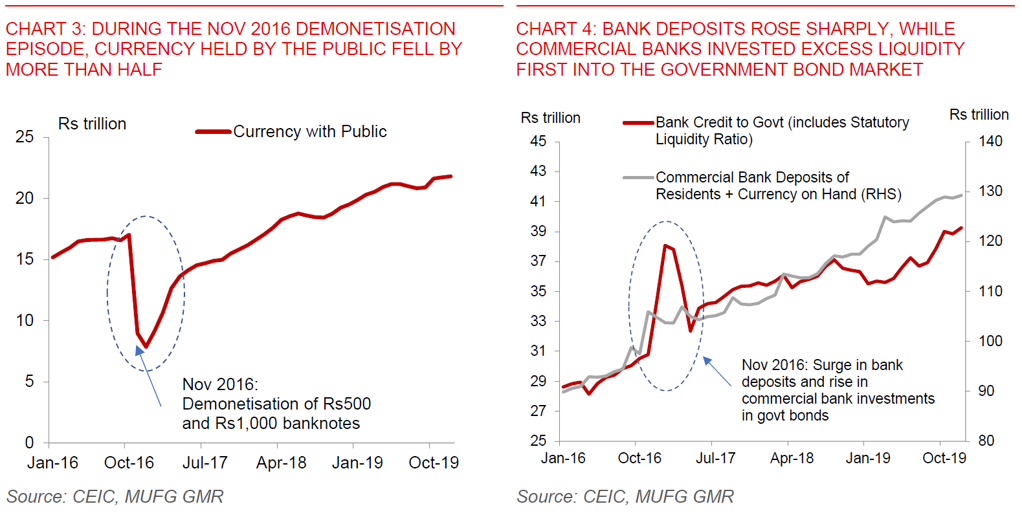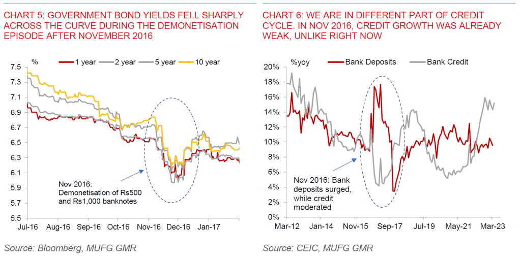 Bank deposits to rise, front-end yields could fall at the margin as banks allocate some extra liquidity to bonds: While the magnitude is far different from the 2016 demonetisation, the direction of travel is likely to be similar (see Charts 3-5 below). The clearest market impact should be felt in the rates market and banking liquidity. Bank deposits are likely to rise over time by around 1%-2% as some (but not all) choose to deposit their old notes. Banks will likely allocate some of this additional liquidity to short-end government bonds. However, given that credit growth is still quite robust at 15%yoy, we doubt that commercial banks will allocate all of the deposit increase to government bonds given alternatives on the asset side.