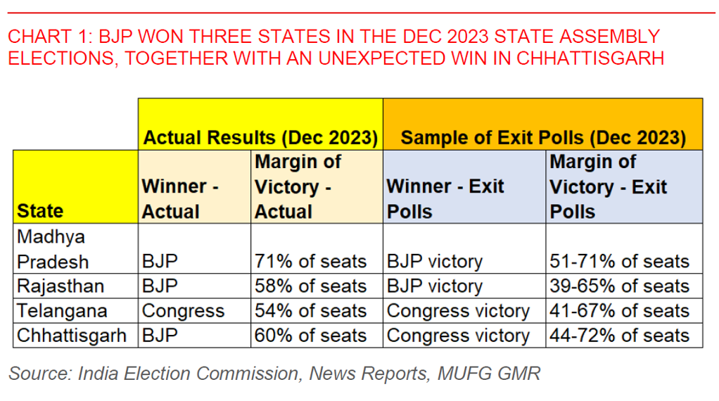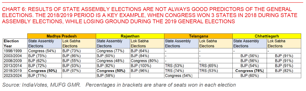 - First, the incumbent BJP achieved a strong margin of victory in larger states with more seats in the Lok Sabha (India’s Parliament). For instance, Madhya Pradesh and Rajasthan have 29 and 25 seats up for grabs in the General Elections, compared with 17 and 11 seats for Telangana and Chhattisgarh. To the extent that the state elections translate into political momentum on the national stage, this could be a tailwind for the BJP in the General Elections.