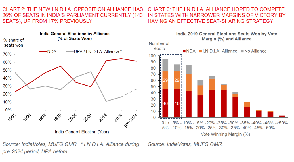 - Moving forward, we will be watching closely to see if the I.N.D.I.A. opposition alliance is able to develop concrete seat-sharing plans for the upcoming General Elections. There is an alliance meeting called for 6 December, and our base case is for various parties to drive difficult negotiations with Congress.