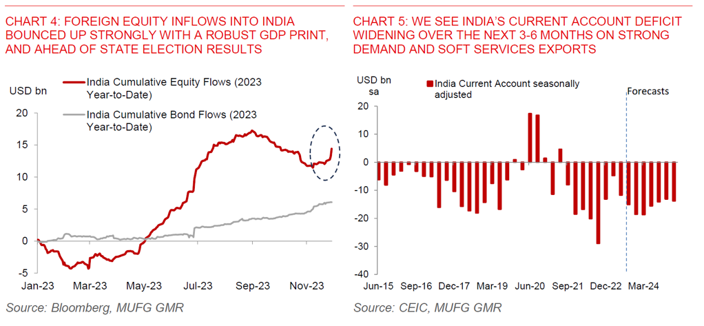 - In terms of market implications, these developments are likely positive for equity inflows, and as such reduces some pressure for INR depreciation in the near-term. This comes even as INR faces some headwinds from India’s widening current account deficit (due to strong domestic demand and soft IT services exports), coupled with slowing FDI inflows (see Turning Cautious INR).