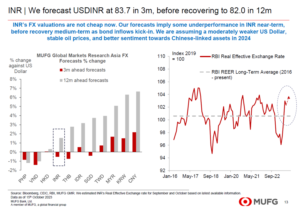 - We are forecasting USDINR at 83.7 in 3 months, before recovering to 82.0 in 12 months, implying some underperformance in INR near-term.
