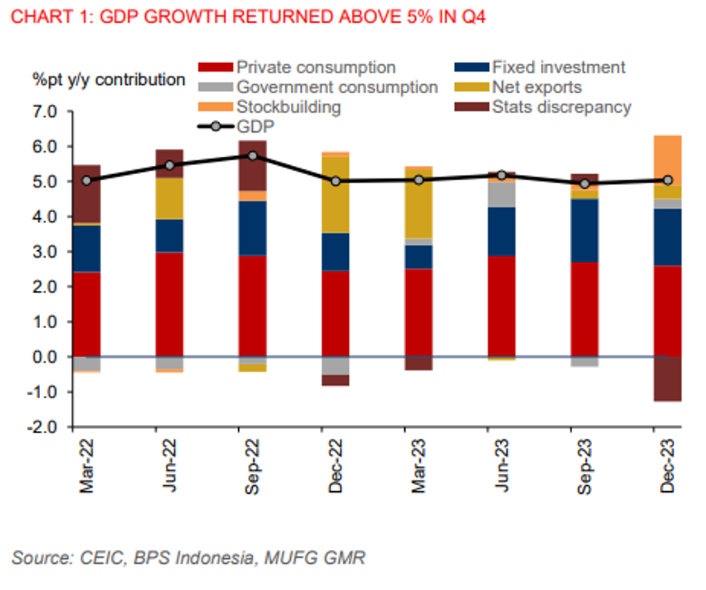 - Domestic demand is feeling the impact of tight domestic monetary conditions and ongoing election uncertainty. Private consumption growth moderated to 4.8%yoy in Q4 from 5.1% in Q3, while fixed investment slowed to just 5%yoy from 5.8%yoy in Q3.