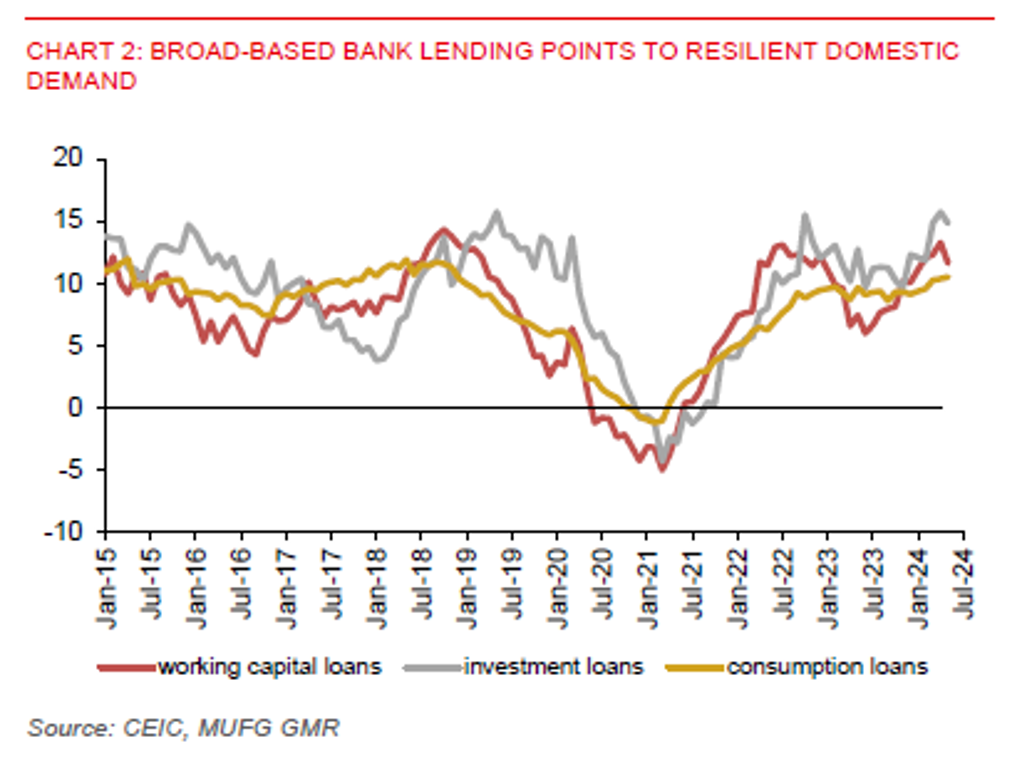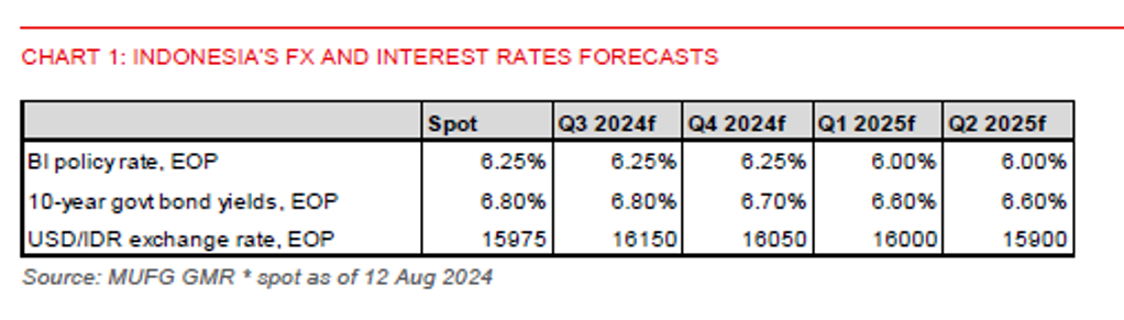 - We have lowered our USDIDR forecast to 16150 in Q3 (from 16420 previously) and 16050 in Q4 (from 16360 previously) to reflect recent easing depreciatory pressure. The rupiah has gotten near-term reprieve, partly resulting from market expectations for a faster pace of US rate cuts this year following weaker than expected US nonfarm payroll data. The rupiah has strengthened past the key psychological level of 16000 to settle at around the 15900-level against the US dollar. But we stay cautious about the rupiah outlook given a highly volatile market environment, where market expectations about US rate cuts could still shift, depending on forthcoming inflation data. Key downside risks could stem from potential escalation of Middle East tensions, which would pose an upside risk to oil prices, and impact of US election uncertainty on markets.