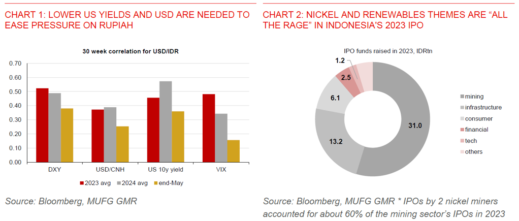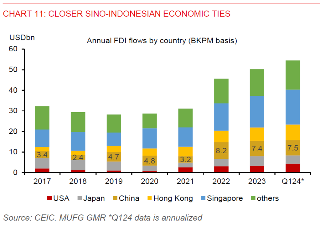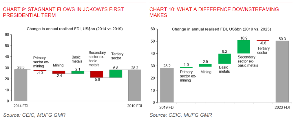- Beyond the short-term headwinds, there’s scope for rupiah stability, given an improvement in the long-term appeal of the currency driven by the nickel export ban in 2020. Indeed, the nickel downstreaming policy has made significant positive contributions to the country’s trade balance and foreign direct investment (FDI) in recent years. Trade surplus in the basic metal sector has risen four-folds to US$14.5bn (1.1% of GDP) in 2023 vs. US$3.5bn (0.3% of GDP) in 2020, while the sector also added US$10.7bn (0.8% of GDP) to annual realised FDI inflows in 2023 compared to 2019 levels.