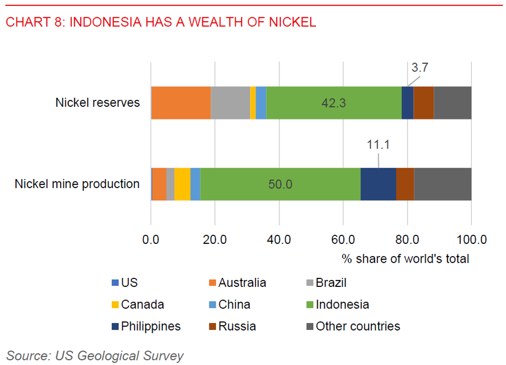 - The nickel downstreaming policy entails Indonesia leveraging its natural advantage as the world’s largest nickel producer to firmly embed itself as a critical player in the upstream segment of the electric vehicle (EV) supply chain. Nickel is a critical ingredient in nickel-based EV battery production. With the country holding more than 40% of the world’s nickel reserves and accounting for half of the global nickel output, according to data from the US geological survey, Indonesia has made itself an indispensable partner in the global transition towards EVs through banning the export of raw nickel in 2020 (Chart 8). This will help capture a higher economic value for its nickel resource, as opposed to exporting low-value raw nickel.