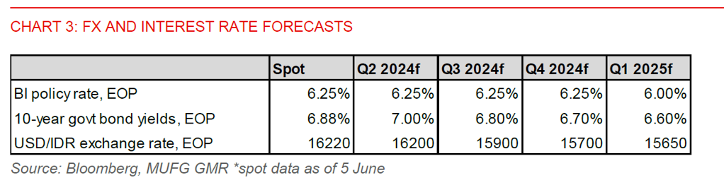 - We forecast USD/IDR to consolidate at around 16,000 in 3 months before falling modestly to 15,650 by early 2025.