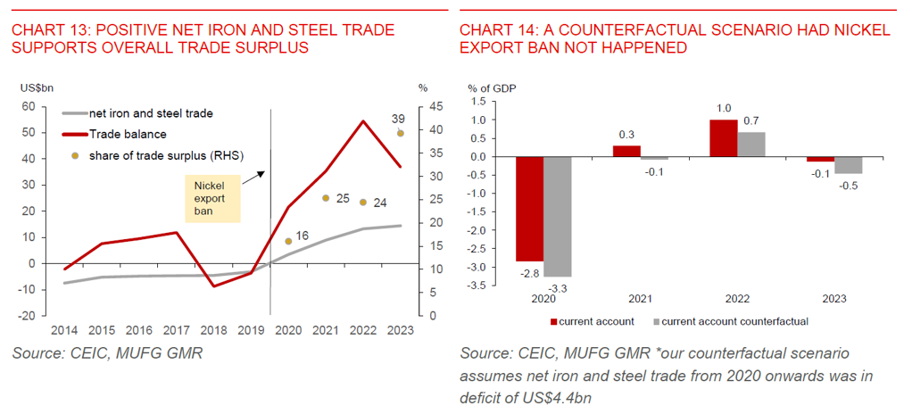 - In addition, the basic metal sector (notably iron and steel) contributed about 40% (US$14.5bn) of the overall trade surplus in 2023, up from just 16% (US$3.5bn) in 2020 during the first year of the nickel export ban (Chart 13). Prior to the export ban, iron and steel trade balance was in deficits, averaging US$4.4bn per year during 2015-2019. Had the iron and steel trade balance in 2023 stayed at the 2015-2019 average deficit of US$4.4bn, Indonesia’s current account would have been much worse, at -0.5% of GDP vs. the actual outcome of -0.1% of GDP (Chart 14). The current account would have also flipped into deficit in 2021, instead of posting a modest surplus.