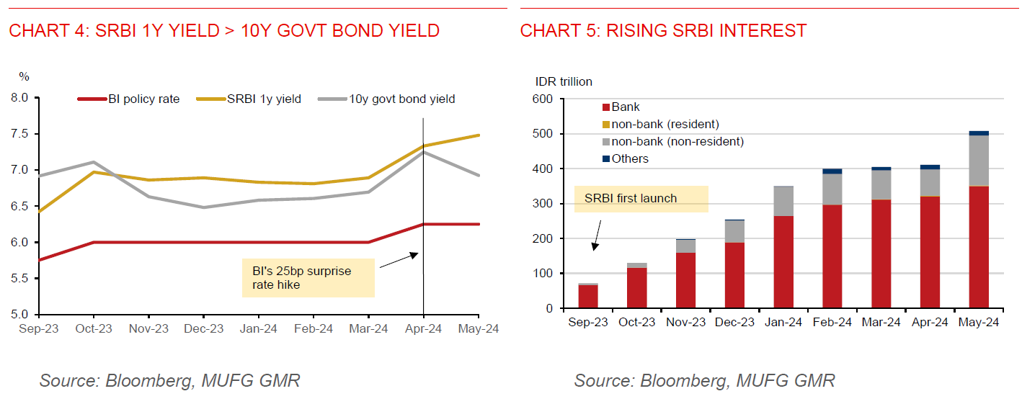 - Bank Indonesia (BI)’s willingness to react swiftly to stem rupiah weakness using a range of instruments should help the rupiah. These instruments include raising the policy rate by 25bps to 6.25% in April, direct FX intervention, and issuing its own rupiah securities (SRBI) at attractive yields of more than 7% (Chart 4). This has helped stabilized the rupiah in May. Notably, the amount of SRBI outstanding jumped IDR97.7tn (US$6.1bn) as of May 21 to IDR508.4tn (US$31.8bn) compared to end-April, marking the largest monthly increase since its inception in September 2023 (Chart 5). The share of foreign holding has also surged to 28.1% in May, up from 18.3% in April.