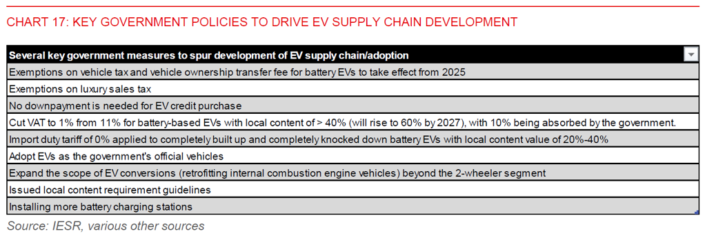 - Currently, Indonesia has a grip on the upstream segment of the EV supply chain, driven by its natural advantage in nickel reserves which is accompanied by the nickel export ban. However, a foray into the midstream (EV battery production) and downstream sectors (EV production), currently dominated by China, will be equally crucial. Encouragingly, we have seen policy positives from the Indonesian government, though more needs to be done to speed up EV adoption.