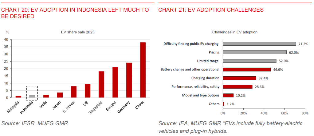 - EV adoption has also gathered pace in recent years, jumping to 17,000 units of 4-wheelers, from less than 100 in 2019. It has benefitted from the government cutting the value-added tax to 1% from 11% for battery based EVs with local content of more than 40% in 2023, with 10% VAT being absorbed by the government. But EV penetration is still relatively low in the country (Chart 20), constraining Indonesia’s ability to woo more EV makers to set up production facilities in the country. Top 3 challenges in faster EV adoption include difficulty in finding public EV charging stations, EV pricing, and limited travelling range (Chart 21). Notably, even with a 10% discount incentive for purchasing an EV, a mid-class EV are still priced above IDR300mn. The market share of four-wheelers priced above IDR300mn was only about 1% in Indonesia.
