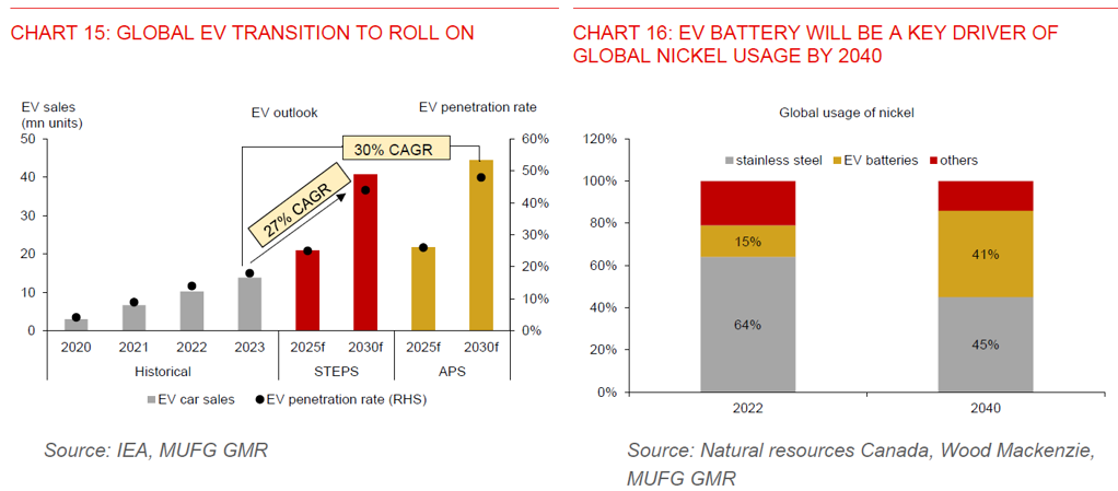 - With the global EV sales expected to grow at a CAGR of 27% to reach more than 40mn units by 2030, there will be increased demand for EV batteries and nickel (Chart 15). Notably, EV battery will be a crucial growth driver of nickel demand in the years ahead. Currently, nickel has mainly been used to produce stainless steel, with only 15% of nickel production going to EV battery manufacturing. But by 2040, it is estimated that the share of nickel for EV battery production will rise to 41% (Chart 16). As such, Indonesia’s rising nickel exports trend is likely to persist. We estimate that nickel downstreaming products could increase to US$56bn (3% of GDP) by 2030, from around US$33.5bn (2.4% of GDP) in 2023, representing a 0.6ppt increase as a share of GDP.
