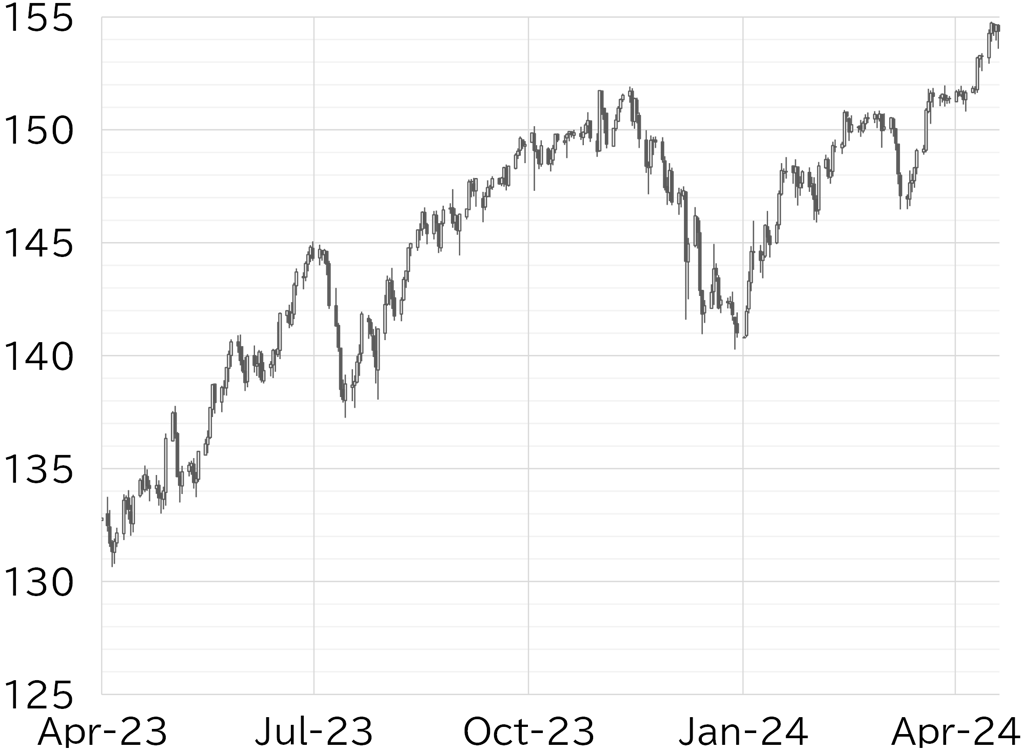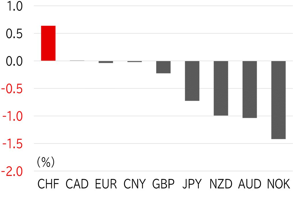 The USD/JPY opened the week at 153.30. It rose gradually on 15 April from the morning in Tokyo trading hours, then shot up to around 154.50 as the dollar strengthened across the board after US retail sales announced in US hours beat the market's forecast. On 16 April, Fed Vice Chair Philip Jefferson suggested the Fed would keep the policy rate on hold, sending the USD/JPY to its high for the week of 154.79, but the pair fell back below 154 following warnings of intervention by Japanese authorities. However, the USD/JPY quickly recovered, rising beyond 154.50 after Fed Chair Jay Powell also hinted that the Fed would delay a rate hike. It became top-heavy on 17 April as the market moved risk off, with a fall in share prices, bonds, and currencies in emerging countries and elsewhere amid a rise in UST yields and dollar strength. The USD/JPY fell below 154.50 in US trading hours following a trilateral meeting of finance ministers from the US, Japan, and Korea. The pair slipped further on 18 April, briefly falling below 154 after Vice Finance Minister for International Affairs Masato Kanda announced in the morning that the G7 had confirmed its commitment on foreign exchange policy based on Japan's stance. However, in US trading hours, NY Fed President John Williams' comment that a rate hike was possible acted to strengthen the dollar, pushing the USD/JPY above 154.50. It remained at this level on 19 April but fell steeply following reports of explosions in Iran and temporarily fell to around 153.50. However, the move to risk off faded amid conflicting information about the incident, and the USD/JPY recovered to the low 154 level (Figure 1). At the time of writing this report, the dollar was strong among G10 currencies, but the Swiss franc was stronger (Figure 2).