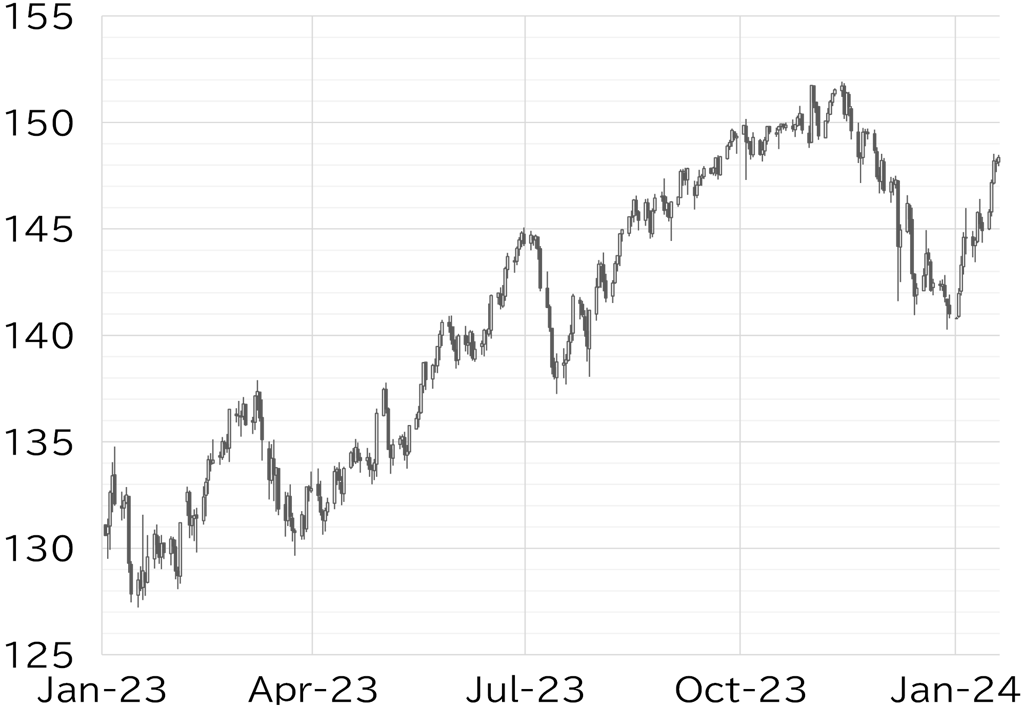 The USD/JPY opened the week at 145.15. It fell below 145 in early in the Tokyo session on 15 January, but the yen started to be sold as share prices rose. It rose intermittently despite the holiday in the US and approached 146. The USD/JPY trended firm on the morning of 16 January, rising to the 146 level around the time the fixing rate was announced, and then continued to rise steadily. It moved lower briefly after the New York Fed Empire State Manufacturing Index announced in US trading hours fell short of the market's forecast, but then rose swiftly to above 147 along with a rise in UST yields following comments by Fed Governor Christopher Waller, which seemed to be aimed at curbing expectations of an early rate cut. Yen selling continued on 17 January. The USD/JPY looked top-heavy as it approached 148 but shot past this level after better-than-expected US December retail sales data was announced in US trading hours. It rose to a high of 148.52, then fell back to the 147 level on 18 January in the Tokyo session due to concerns about its rapid ascent. However, the announcement of strong economic data in US trading hours, including a sharp drop in US new jobless claims, sparked a recovery to above 148. Atlanta Fed Reserve President Raphael Bostic's remarks toward the end of trading hours in the US helped propel long-term UST yields to 4.15%, and the USD/JPY was testing recent highs as of writing this report on 19 January (Figure 1).