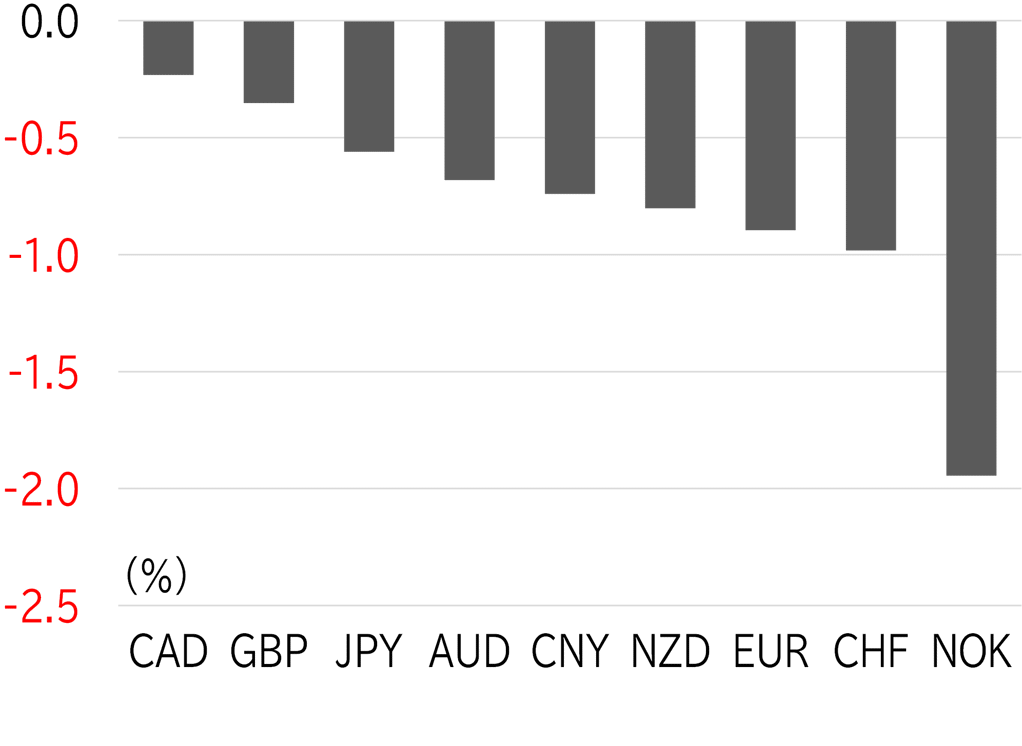 This week, the dollar strengthened across the board. The yen sat in the middle of the pack among G10 currencies in the absence of any notable movers. The Swiss franc lost ground as risk-off sentiment receded. Meanwhile, the Norwegian krone weakened as oil prices softened, but the Canadian dollar, which is also a commodity currency, was relatively strong (Figure 2).