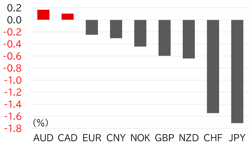 The USD/JPY opened the week at 148.95, which was also the weekly low. Over the weekend, media reports had speculated that the BOJ would end the negative interest rate policy due to the outcome of spring wage talks, but the news was broadly as expected and did little to move the market. Dollar buying was slightly dominant on 18 March due to the rise in UST yields, but the market remained in wait-and-see mode ahead of the BOJ and FOMC monetary policy meetings, and the USD/JPY stayed in the 149.00 – 149.50 range in US trading hours. The BOJ voted to end the negative interest rate policy at its board meeting on 19 March. It also voted to end yield curve control (YCC) and suspend purchases of ETFs and other assets in principle, bringing an end to its massive monetary easing program. However, the details of the decision were largely in line with previous media reports, with the statement and Governor Ueda's press conference leading to expectations that the BOJ will not hike rates for some time. The market moved to sell yen on the view that spreads between domestic and overseas yields would not narrow further, and the USD/JPY rose to nearly 151.00 after foreign investors entered the market. Yen selling continued in the morning on 20 March due to a lack of Japanese investors during the spring equinox public holiday. In US trading hours, the USD/JPY rose to 151.82 for the first time since 14 November 2023. The FOMC statement remained largely unchanged, and the dot plot maintained the outlook for three rate cuts this year. At a press conference, Fed Chair Jay Powell indicated that he was monitoring the recent acceleration in inflation and that the Fed would soon start slowing the pace of reducing its balance sheet. The USD/JPY fell to above 150.50 with the dollar weakening because the Fed did not make a hawkish shift as had been expected. The USD/JPY fell to below 150.50 on 21 March as yen buying made headway through to the fixing rate announcement, but it then rebounded after Governor Kazuo Ueda's parliamentary hearing. The pair recovered to above 151.00 after foreign investors entered the market, while UST yields rose following stronger-than-expected US economic data and the Swiss National Bank unexpectedly decided to cut rates. The USD/JPY again extended to beyond 151.50. It softened slightly from a high of 151.86 after the fixing rate announcement on 22 March and was hovering around 151.50 at the time of writing this report (Figure 1). Among major currencies, the Swiss franc was sold after the SNB moved first to cut rates, but the yen was even weaker (Figure 2).
