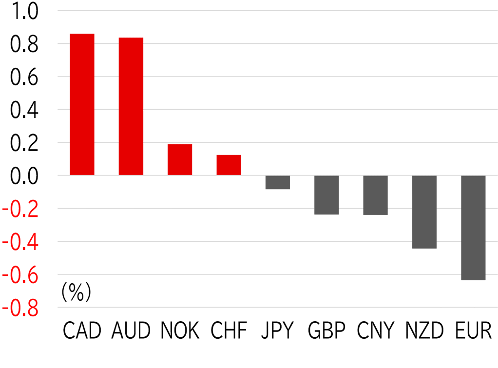 The USD/JPY opened the week at 154.67. The pair fluctuated by over one yen following a speech by BOJ Governor Kazuo Ueda during the Tokyo session on the morning of 18 November, then rose to the low 155 level through US trading hours. The USD/JPY fell sharply on 19 November due to reports that Russia had lowered its standards for the use of nuclear weapons, reaching a low for the week of 153.28. The pair recovered on the same day, then bounced back to above 155 during the Tokyo session on 20 November in the absence of any particular news, before hitting a high of 155.86 early in US trading hours. However, it became top-heavy at just under 156 and moved lower through 21 November. In the afternoon (Tokyo time) of the same day, the USD/JPY adjusted to around 154.50 following the release of an article in which New York Fed President John Williams discussed the need to curb inflation and eventually lower interest rates, which coincided with the headline from Governor Ueda's press conference. The pair dropped further during European trading hours after reports surfaced that Russia had launched a new type of missile at Ukraine. The USD/JPY briefly rebounded before falling below the 154 mark during US trading hours. However, it did not fall far below 154 and subsequently traded in a narrow range below 154.50. On 22 November, during the Tokyo session, it briefly touched below 154 before settling back in the low 154 range at the time of writing this report. Additionally, news that president-elect Donald Trump plans to nominate former Fed Governor Kevin Warsh as Treasury Secretary and potentially appoint him as the next Fed Chair after Jay Powell had little impact on the USD/JPY. (Figure 1). Among G10 currencies this week, commodity currencies such as the Canadian dollar, Australian dollar, and Norwegian krone showed strength, followed by the Swiss franc, the dollar, and the yen (Figure 2). Overall, we think these moves were largely driven by the evolving situation in Ukraine.