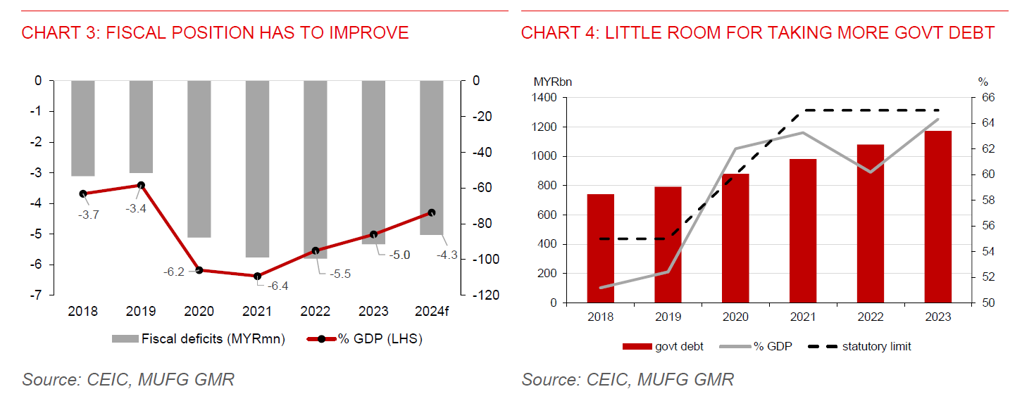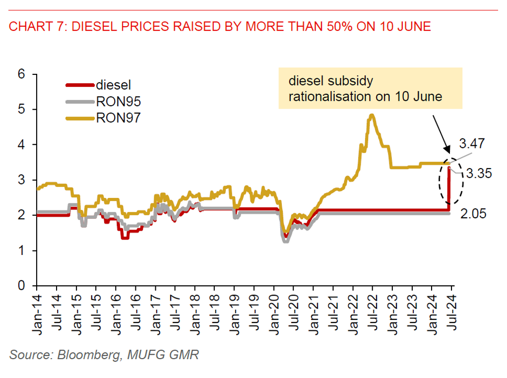 - While the diesel subsidy reform is a positive step, more subsidy cuts will likely be needed to narrow the fiscal deficit to 4.3% of GDP as planned for this year. The government has planned to cut the subsidy by MYR11.5bn, based on its 2024 budget. The measures that have been taken so far – raising diesel prices (MYR4bn/year) and lifting subsidies for chicken and eggs (MYR3.8bn/year) in November 2023 - add up to only about MYR7.8bn of potential fiscal savings per year. This leaves another MYR3.7bn of subsidy cut that is required.