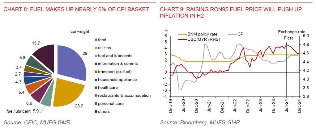 - We expect the government will rationalise RON95 fuel subsidies this year. In a scenario where the government lifts RON95 fuel prices at the start of H2, we estimate prices will have to be raised by 35sen to MYR2.40/litre, or about 17% higher than the subsidized price of MYR2.05/litre. This would add about 1ppt to headline inflation, given fuel accounts for about 5.9% of the CPI basket (Chart 8). This, along with inflation that averaged just 1.7% in the first four months of this year, has led us to forecast headline inflation to average 2.3% in 2024 (Chart 9). But we are cognizant that this inflation outlook could understate the extent of indirect second round price effects. Given the upside risk to inflation, we think BNM is in for a prolonged rate pause at 3%. A slower pace of rationalising RON95 fuel price also means that prices will have to be raised by much more to achieve the remaining MYR3.7bn of required cuts.