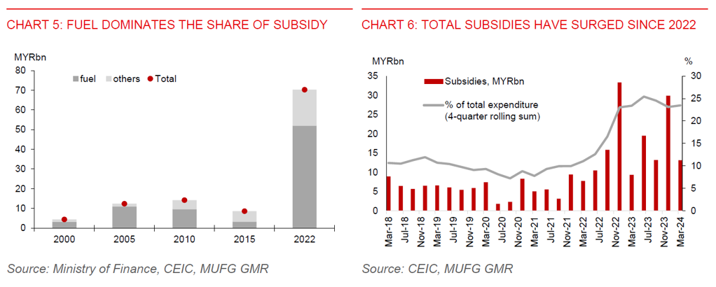 - Over the medium term, our outlook for the ringgit remains positive, partly in anticipation of an eventual decline in the US policy rate and partly as the diesel subsidy rationalisation marks the start of fiscal consolidation. Fiscal risk has been a concern, following large Covid-induced outlay and a substantial rise in fuel subsidies brought about by the surge in crude oil prices during 2022 (Charts 5 and 6). Notably, diesel subsidies rose to MYR14.3bn in 2023, from just MYR1.4bn in 2019.