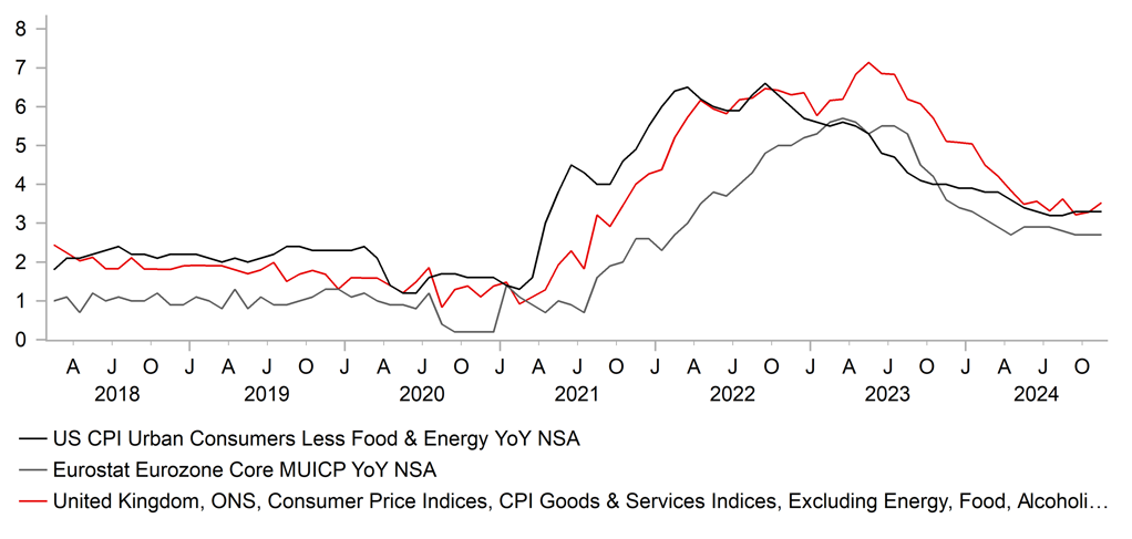 As can be seen from the intra-day high, the entire drop in EUR/USD took place in Q4 as investors positioned for a second Trump presidency. The 7.0% drop in Q4 certainly signals markets are well positioned for Trump’s trade policies being implemented quickly. But EUR performance ahead will also be driven by domestic fundamental factors that may push EUR/USD further lower but pessimism is very high and we suspect ECB pricing on rate cuts for this year is overdone. The OIS market is priced for the ECB’s policy rate falling to 1.75% but we suspect the ECB will pause cutting sooner, possibly at 2.25% or 2.00%. While trade tariffs will be a drag on growth, still high nominal wage growth and inflation now close to target, real income growth this year should help support domestic demand conditions. The ECB’s sole mandate is price stability and given we have just exited the largest global inflation shock since the late 1970’s/early 1980’s we do not envisage the ECB rushing into accommodative territory until a pause and thorough assessment.