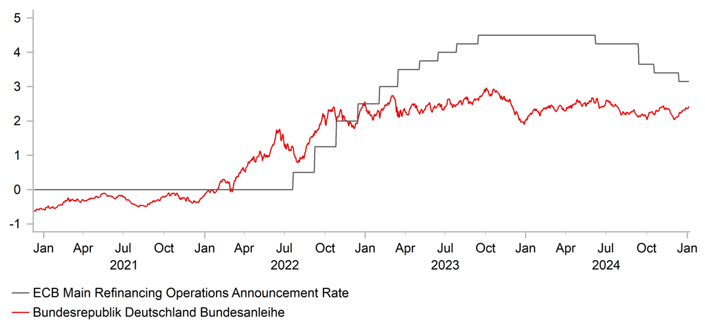The 10-year bund yield increased in 2024, by 35bps to close at 2.37%. On a closing basis, the range for the 10-year bund yield was 2.02% to 2.69% so the closing level was close to the mid-point of the range for the year as a whole. The move higher in the 10-year bund yield last year was more subdued than in the US or UK with weaker economic growth and more subdued inflation depressing the move higher. The ECB was more active than the BoE in cutting rates and for this year market pricing indicates more cuts by the ECB than the Fed. Economic growth has been undermined by the lack of political leadership at the heart of the euro-zone with Germany in political gridlock and France political uncertainty high after elections last summer. We expect annual CPI to stabilise at around the 2% target level this year and for the ECB to ease further with the policy rate set to fall to 2.00%. The OIS is therefore a little over-priced for rate cuts which should mean we see some upward pressure on yields at the short-end of the curve later in the year. Given out UST bond yield forecasts we see scope for a moderate move higher in 10-year bund yields.