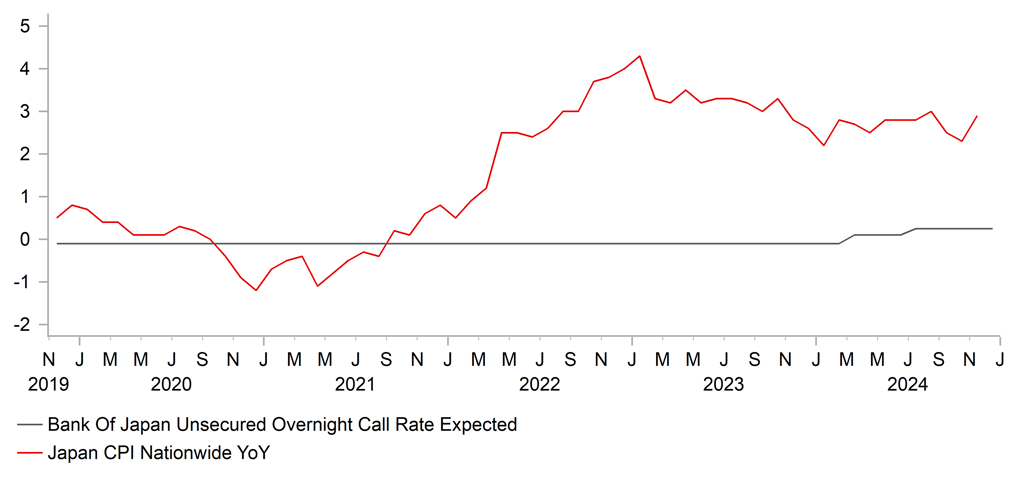 The 10-year JGB yield increased in 2024 by 49bps to close at 1.10%, the highest calendar year close since July 2011 before negative rates and Governor Kuroda’s time at the BoJ marked by ultra-easy monetary policies. The rise was helped by the BoJ ending negative rates, lifting the key policy rate twice by a total of 35bps to 0.25%. The communications from the BoJ of late does point to the potential for inaction over the coming BoJ meetings with Governor Ueda wanting more information on wage negotiations (‘shunto’) and tim to assess US trade policy steps. But we see the monetary policy board as slowly turning more hawkish. The recent minutes suggested growing support for rate hikes ahead. Political instability is a risk that could see the BoJ maintain caution but the flip side of that is that if political instability fuels yen selling, it may encourage the BoJ to hike. We see the policy rate being lifted two times to 0.75% this year although there are downside risks to that view. More hikes, steady underlying inflation and elevated 10-year yields abroad should see the 10-year JGB yield drift further higher this year