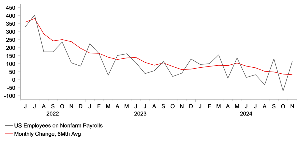 The BoE’s MPC was more cautious in cutting rates last year which helped support GBP. We see that caution giving way and cuts will be more aligned this year to actions taken by the Fed and the ECB. There is a risk later this year the MPC is more active than we assume. Our current assumptions imply 50bps more cuts than priced. The 6-3 vote in December highlights the overall composition of the MPC is shifting a little more dovish. Key remains wage growth and while the labour market data is less reliable the PAYE jobs data does point to weakening labour demand. The 6mth MAV PAYE employment change fell to nearly -8k in the latest data. Wages growth should slow from here especially given the NICs increase. That will allow the MPC to cut by at least 100bps this year.