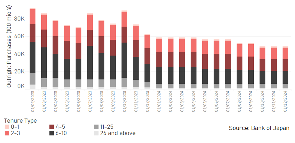 In 2024 the euro weakened against the US dollar in terms of London closing rates from 1.1059 to 1.0400. The intra-day high was 1.1214 in September and the intra-day low was 1.0335 in November. Following the aggressive policy tightening in 2022 and 2023 the ECB began reversing course in June by cutting by 25bps to 3.75%. after skipping a policy easing in July, the ECB then cut at the final three meetings of the year taking the policy rate to 3.00%. QT proceeded throughout the year with the Asset Purchase Program (APP) down EUR 328bn at EUR 2.698trn as of end-November. The TLTRO balance was essentially close to zero, down from EUR 396bn at the end of 2023. The PEPP balance was close to unchanged at EUR 1.62trn. Total assets on the ECB’s balance sheet fell EUR 584bn as of 12th Dec.