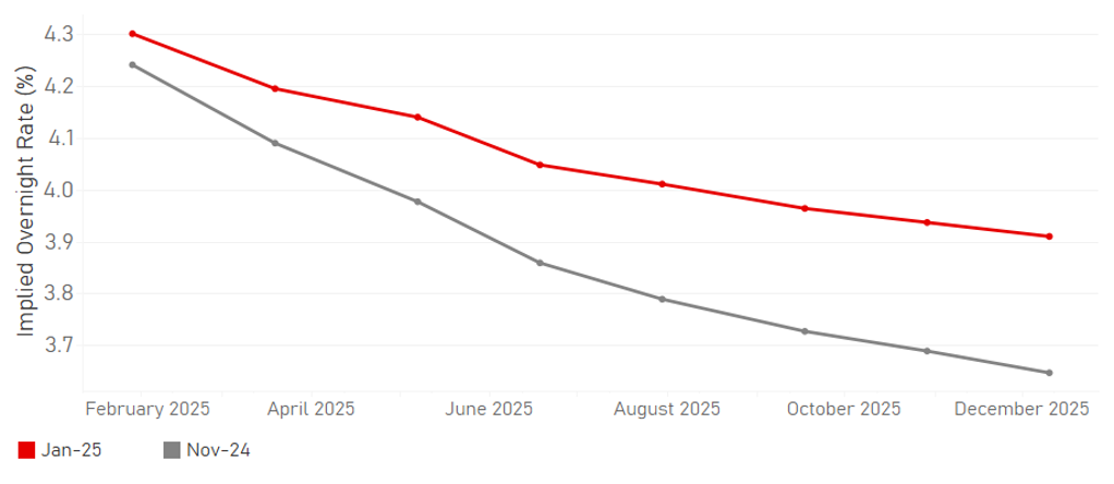 The 10-year Gilt yield jumped notably in 2024, rising by 103bps to close at 4.57%. For much of last year the UK grappled with stickier underlying inflation driven in part by a tighter labour market and higher wage growth. UK growth outperformed in H1 before slowing in H2 but overall growth, expected to be 0.9%, was much stronger than expected at the start of the year. The market consensus for real GDP growth was just 0.3% at the start of last year. Stronger growth and stickier underlying inflation resulted in the BoE being much more cautious in cutting rates. We expect the BoE to be more active this year as the labour market softens and wage growth slows, helping to bring down services inflation. We expect the MPC to cut rate on four occasions this year, by 100bps in total. That would still leave the monetary stance mildly restrictive in our view. The UK budget in October resulted in an increase in Gilt issuance of nearly GBP 20bn to GBP 197bn and the OBR described the budget as “one of the largest fiscal loosenings of any fiscal event in recent decades”. This will limit the scope for 10-year yields to drop this year but assuming 100bps of cuts and easing inflation, we expect to see some modest declines.
