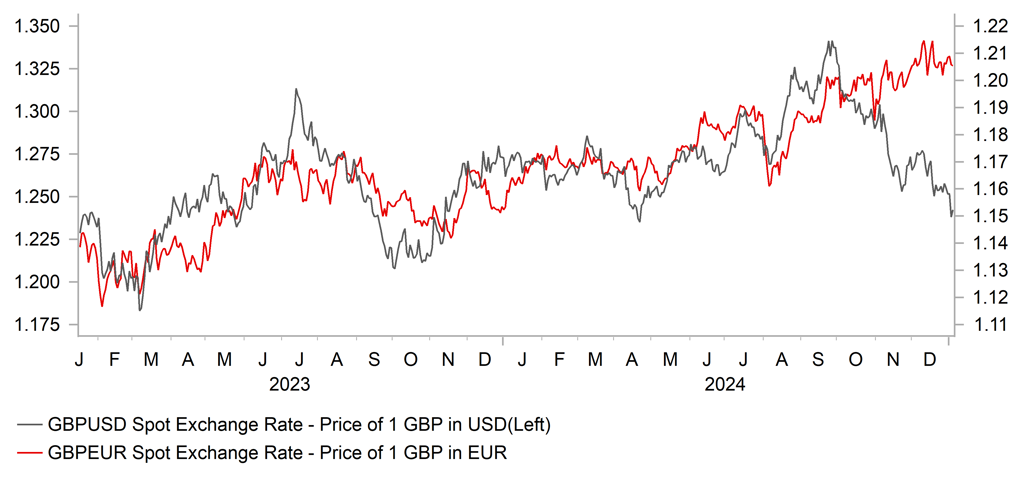 The US dollar surged by 7.0% (DXY basis) in 2024 after a 2.3% drop in 2023. It was the third year in four when the dollar advanced by over 5.0%. All of the dollar strength in 2024 came in the final quarter of the year as market participants positioned for a Trump election victory. Confirmation of that victory and comments from Trump since have raised expectations of trade tariff announcements on the day of inauguration (20th January) or in the days immediately after. We expect trade tariffs to be the focus and market expectations will not be disappointed with much more widespread action from the start than in Trump’s first term in office. We may also see a post-election bounce in activity which is already evident in the sentiment data. However, policy remains restrictive and beyond this period (Q1 into Q2) we see the economy slowing and the Fed cutting rates further following a pause that could feasibly last through to May. Slower growth and a more active FOMC in cutting rates in H2 should then see the dollar partially reverse the dollar strength recorded since Q4 last year.