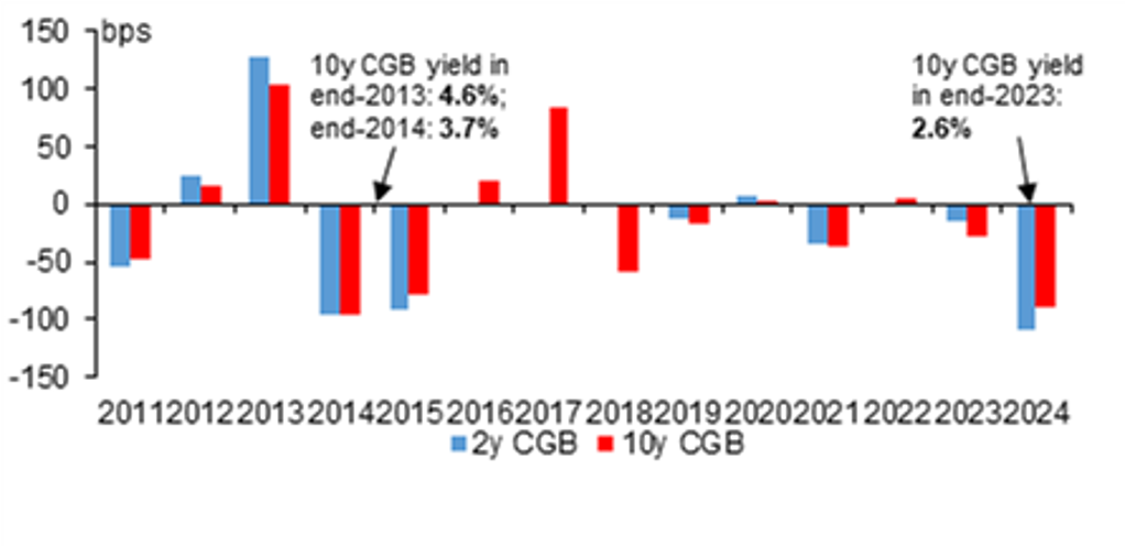 In 2024, China’s government bonds staged a strong rally across the curve with 10y CGB yield down by 89bps to 1.68%, a historical low. In fact, a strong bond rally is not new as it happened at similar magnitude in 2014 and 2015 also driven by deflationary concerns and overcapacity issues, but the bond yield starting points were higher compared to 2024 (4.6% in end-2013; 3.7% in end-2014 vs 2.6% in end-2023). This highlights a stronger deflationary pressure, weaker growth prospect and domestic sentiment today than in 2014/2015. The shift of monetary policy stance to “moderately loose” – the first time since the GFC, and the vow to reduce RRR and interest rates at an “appropriate time” from December’s Politburo meeting and annual CEWC highlight the government’s easing stance in 2025, which pushed the 10-year CGB yield lower in December (-36bps). We expect the PBoC to deliver a 40bp cut on 7-day reverse repo rate to 1.10% in 2025, as well as 50-75bps RRR cut to partly ease the liquidity condition from the planned increased government bond issuance in 2025. We forecast 10y CGB yield to reach 1.60% in Q1 2025 and 1.80% at end-2025.