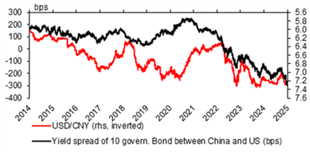 For March’s NPC meeting, we expect a 5.0% growth target set for 2025, to provide some upbeat sentiment and show government’s determination, amid the strong headwinds from Trump’s tariffs on China’s goods. However, given a potential lengthy destocking process of property inventory and lacking of easy levers to quickly turnaround domestic economy, China’s GDP growth may eventually end with a 4.5%yoy GDP growth for 2025. We assume phased tariffs on China and the first batch could start as soon as Trump takes the office. Despite declining from 2017’s 21% to current 13%, China’s exports exposure to US demand is still large, especially considering those indirect exports to US. For USD/CNY, with our assumption of US’s average tariffs on imports from China increasing from 19% to 40% during Trump’s first half year, we expect the USD/CNY to reach 7.4000 by Q1 and 7.5000 by Q2. Our forecasts also reflects US dollar weakening from Q2 onwards. Risks to our call on USD/CNY hinge on the magnitude and timing of the tariffs, and also the US dollar’s actual path in 2025. A sizeable negative China-US yield spread may persist in 2025 and keep USD/CNY at elevated levels.