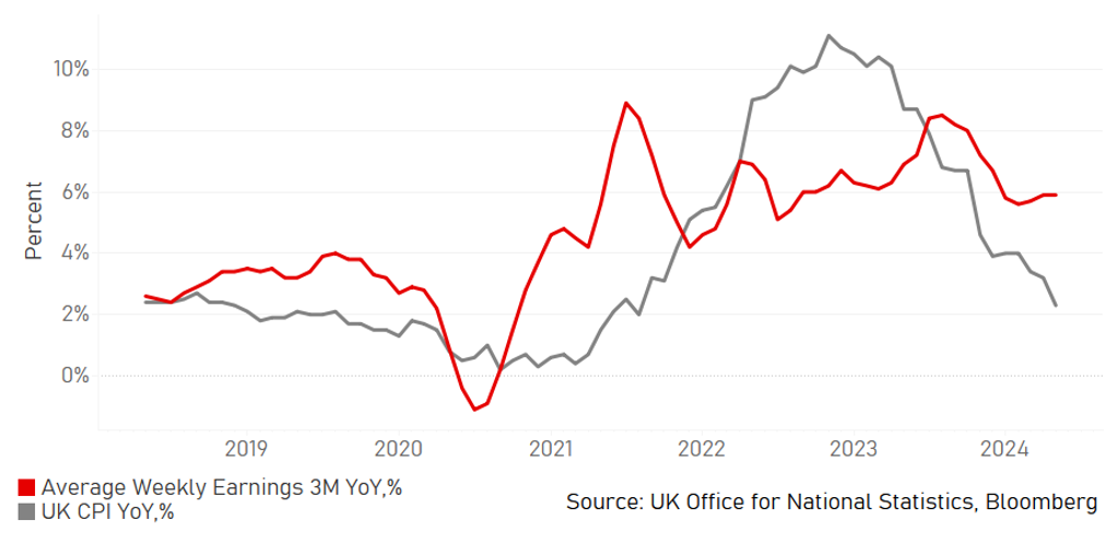WEEKLY EARNINGS 3M YOY,% VS. UK CPI YOY, %
