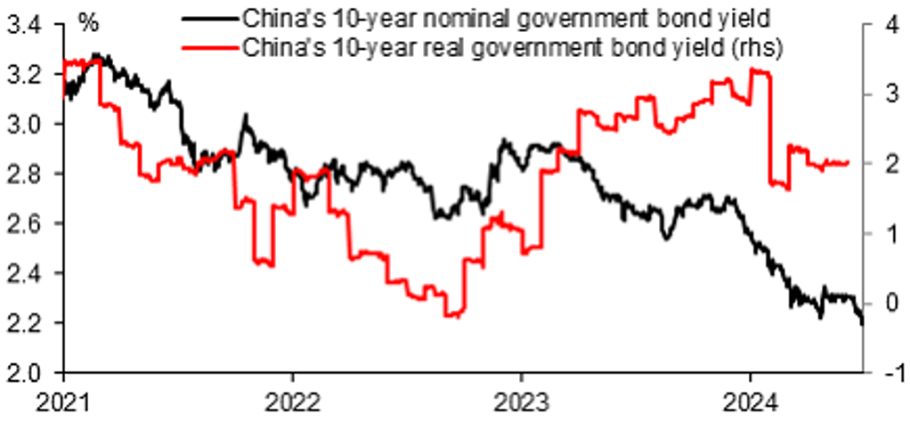 In June, amid a 1.1% appreciation of the US dollar, measured by the DXY index, CNY weakened by 0.34% against the dollar. The continued strength of the dollar (due to the postponing of Fed’s policy rate cut, weakness in EUR and JPY, and still better economic fundamentals in the US compared to Europe) explained a significant portion of the CNY’s depreciation. CNY’s depreciation against the dollar in June was passive to some degree. Having said that, CNY also suffered from the negative market sentiment due to China’s own weak domestic economic and stock market performances. May data implied that the Chinese economy was still facing heavy challenges and real estate sector was still not out of woods yet (ChinaPulse - Government bond issuance is catching up the race to support economy, 19th June 2024). Industrial profits growth dropped to 0.7%yoy in May from April’s 4.0%yoy. The elevated US rates and geopolitical risks also weighed on FDI flows into China. FDI YTD contracted by 28.2%yoy in May, even worse than April’s contraction of 27.9%yoy YTD. Both domestic and overseas sentiments about China were low.