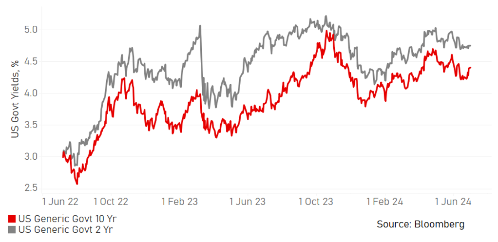 The 10-year Gilt yield declined by 15bps to close at 4.17%, a little bit more than the decline in UST bond yields. The MPC meeting in June was important and has certainly strengthened our conviction on a rate cut being delivered in August. The MPC voted again 7-2 to hold rates steady but for “some” of the seven to vote to hold the decision was a close call. Assuming there is no big inflation upside surprise, a rate cut should be delivered in August along with potentially two further cuts in November and December. The risk is the MPC cuts less and services inflation and wage growth remain the areas of greatest concern for the MPC. But labour demand is weakening and there has been a drop in the PAYE employment data in three of the last four months with the median wage rate slowing. Assuming two-to-three cuts this year and four in 2025 would get the policy rate much closer to the rough estimate of the equilibrium policy rate of between 3.00%-3.50%. The market is currently priced for around 115-120bps of easing by the end of next year , so we see scope for front-end yields to drop more which will help lower the 10-year yield as well (but by less resulting in a steepening of the curve) to around the 3.50% level by mid-2025.