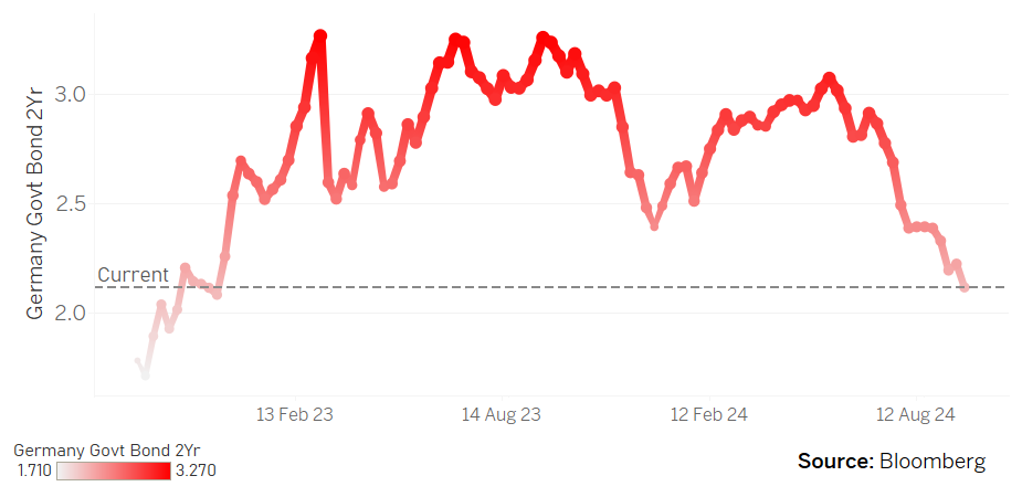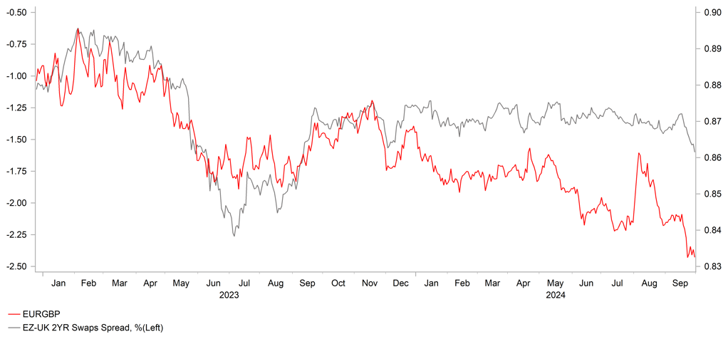 The gridlock in France since the general election could be about to influence broader sentiment and undermine investor confidence weighing on euro performance. The OAT/Bund spread has widened out close to 81bps and a speech by PM Barnier on the budget on 1st October could fuel further selling if deemed as unlikely to garner approval. France’s budget deficit is at about 6% of GDP, well above the 3% limit and the OAT/Bund spread is now at levels not seen since the EZ debt crisis in 2012.