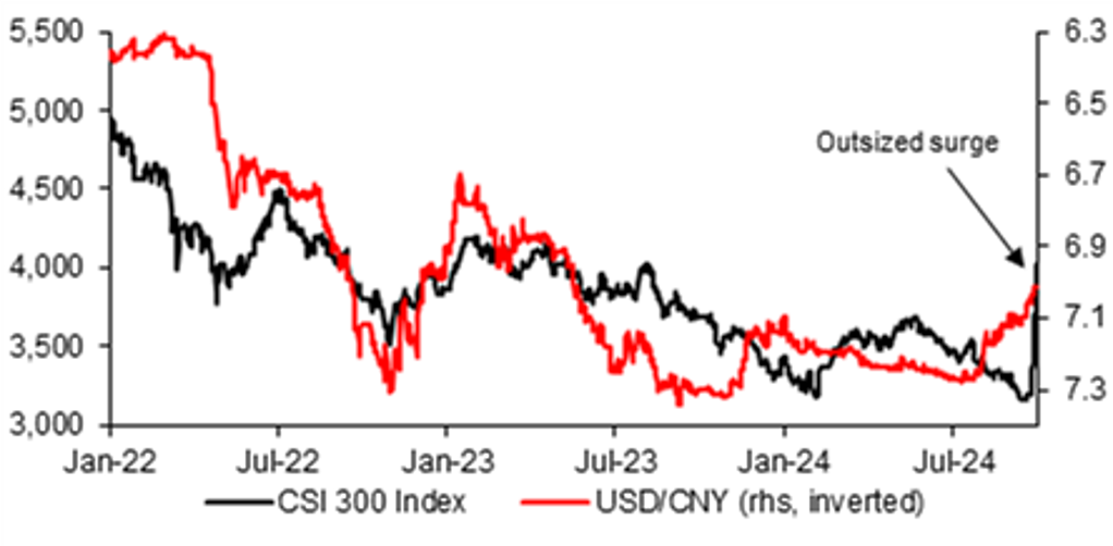 There are good reasons to believe that the 3Q GDP year-over-year growth will decline further from Q2, as both July and August’s growth rates of China’s major economic indicators slowed, and the average of the PMI index levels in Q3 was lower than that of Q2. The rising surveyed unemployment rate in August also helps to strengthen this belief. Notably, the August data still showed no rebound in activities in the housing sector yet, while the divergence between resilient external demand for China’s goods and weak domestic demand remains. All that said, CNY strengthened, and this time, for the reasons we have been hoping for. While the degree of CNY’s appreciation largely mirrored the DXY’s depreciation in September, recently announced policy stimulus, including Politburo meeting’s aim to achieve targeted growth this year (i.e., 5% GDP growth) and potential fiscal expansion, all provided support for the currency.